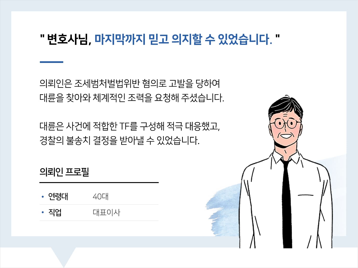 전문변호사와 함께 사건을 진행하여 조세범처벌법위반 혐의가 없음을 입증하고 평온한 일상을 되찾고자 부산조세전문변호사를 찾아주셨습니다.